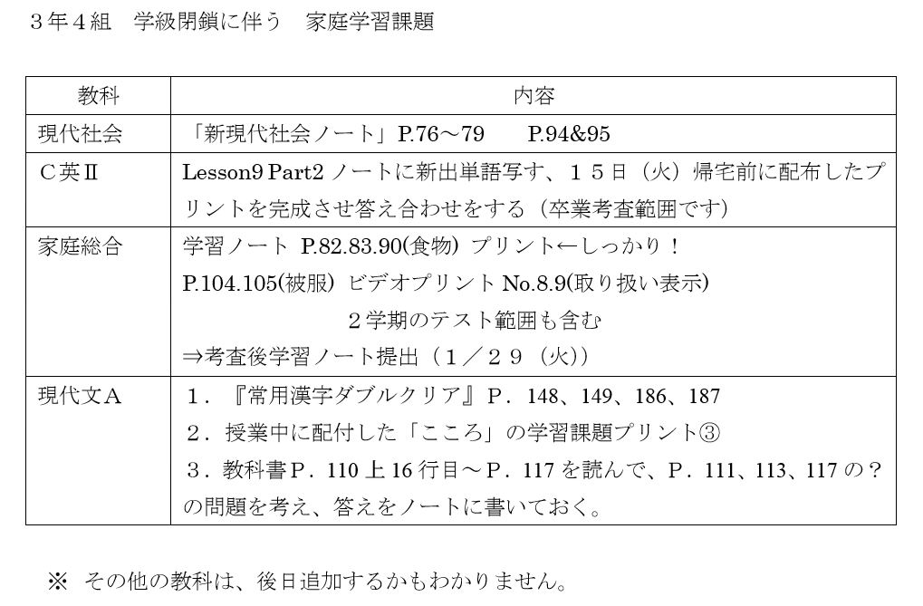 3年4組 学級閉鎖に伴う 家庭学習課題