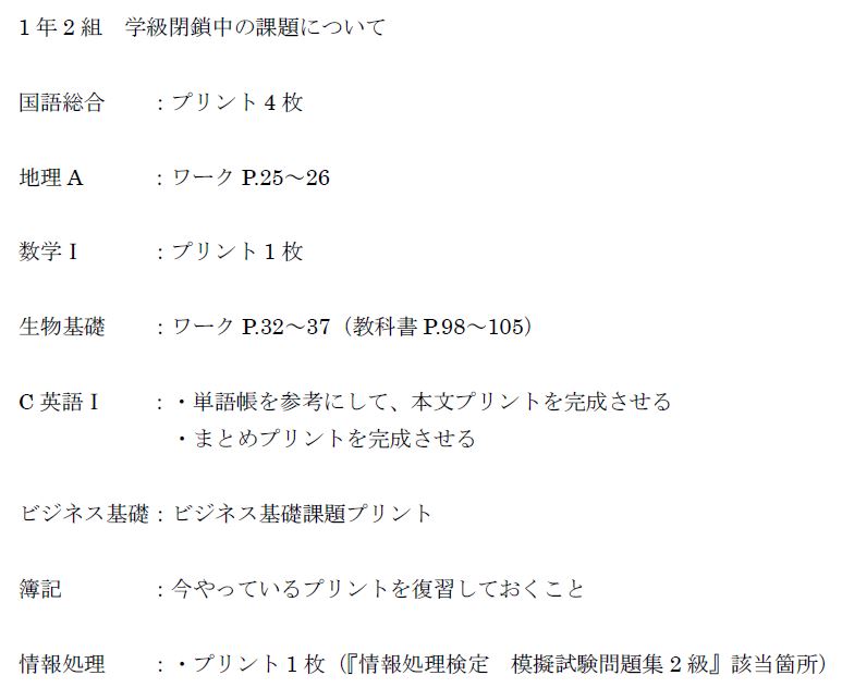 国語総合 :プリント4枚 地理A :ワークP.25~26 数学Ⅰ :プリント1枚 生物基礎 :ワークP.32~37(教科書P.98~105) C英語Ⅰ :・単語帳を参考にして、本文プリントを完成させる ・まとめプリントを完成させる ビジネス基礎:ビジネス基礎課題プリント 簿記 :今やっているプリントを復習しておくこと 情報処理 :・プリント1枚(『情報処理検定 模擬試験問題集2級』該当箇所)
