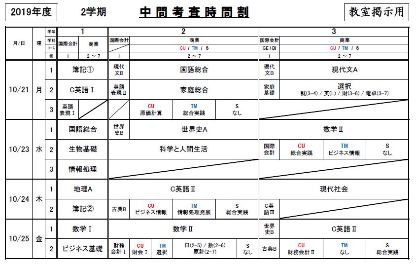 2学期 中間考査時間割