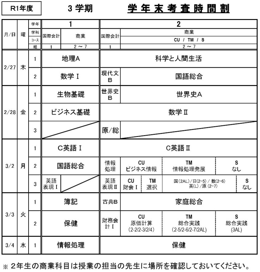 学年最後の考査です。 提出物があれば必ず提出し、しっかりと学習計画を立てて、良い成績が得られるように体調管理にも気を付けて頑張って下さい。