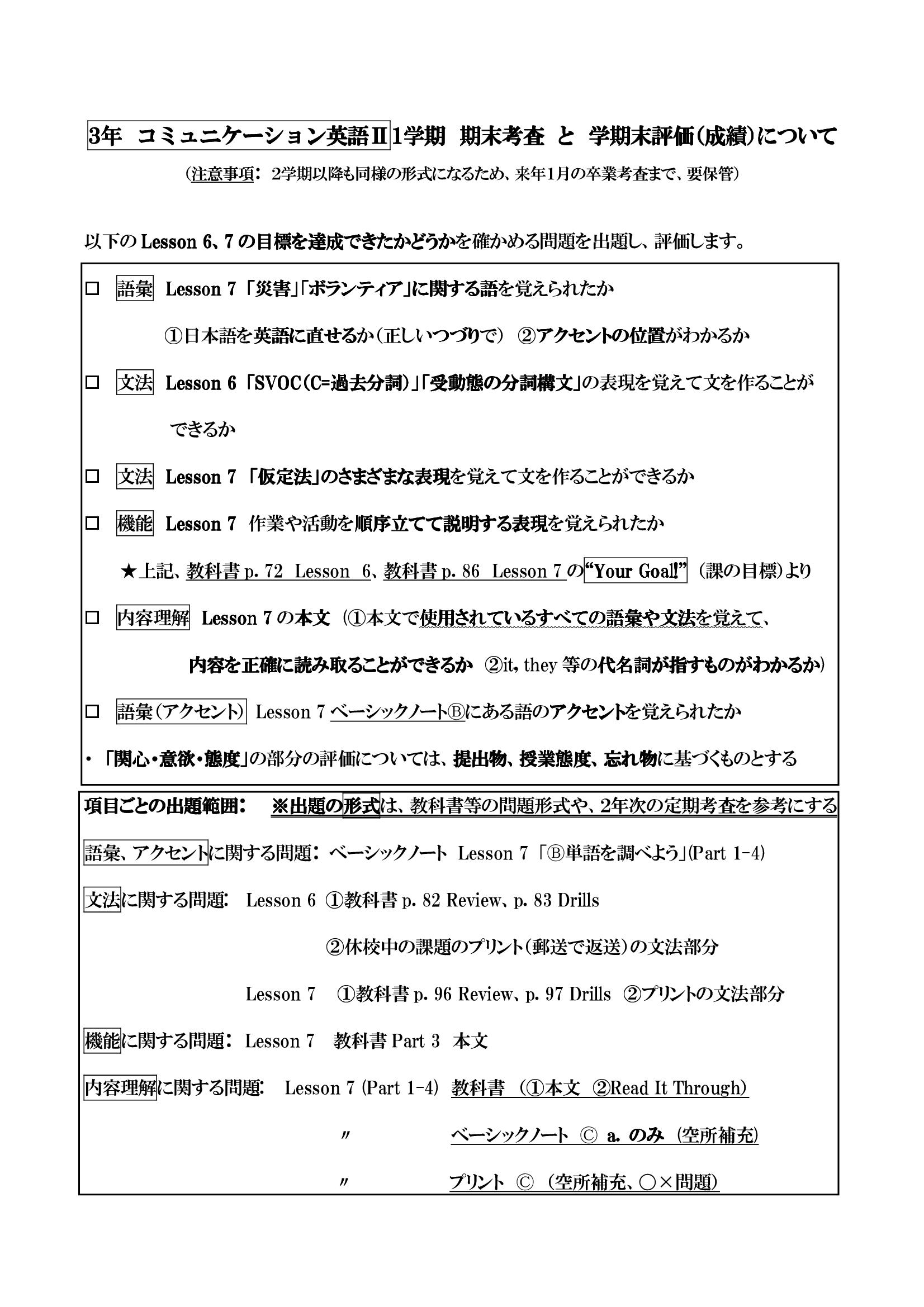 3年コミュニケーション英語Ⅱ1学期 期末考査と学期末評価(成績)について
