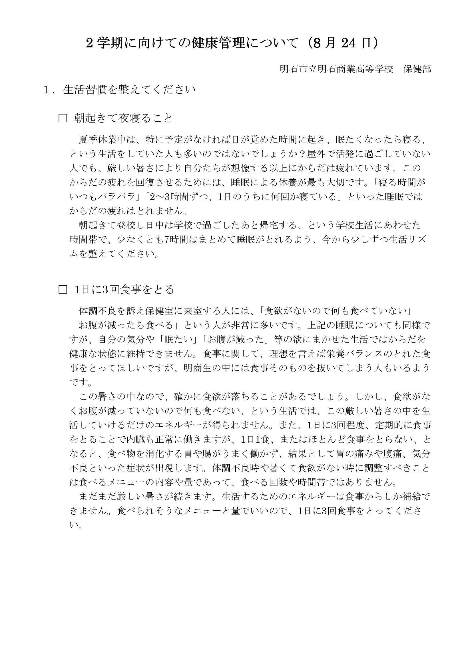 2学期に向けての健康管理について