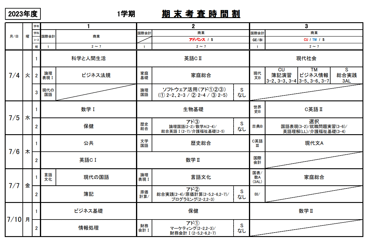 考査の出題範囲を学年通信や担当の先生に確認して提出物があれば必ず提出ししっかりと学習計画を立てて、良い成績が得られるように体調管理にも気を付けて頑張って下さい。