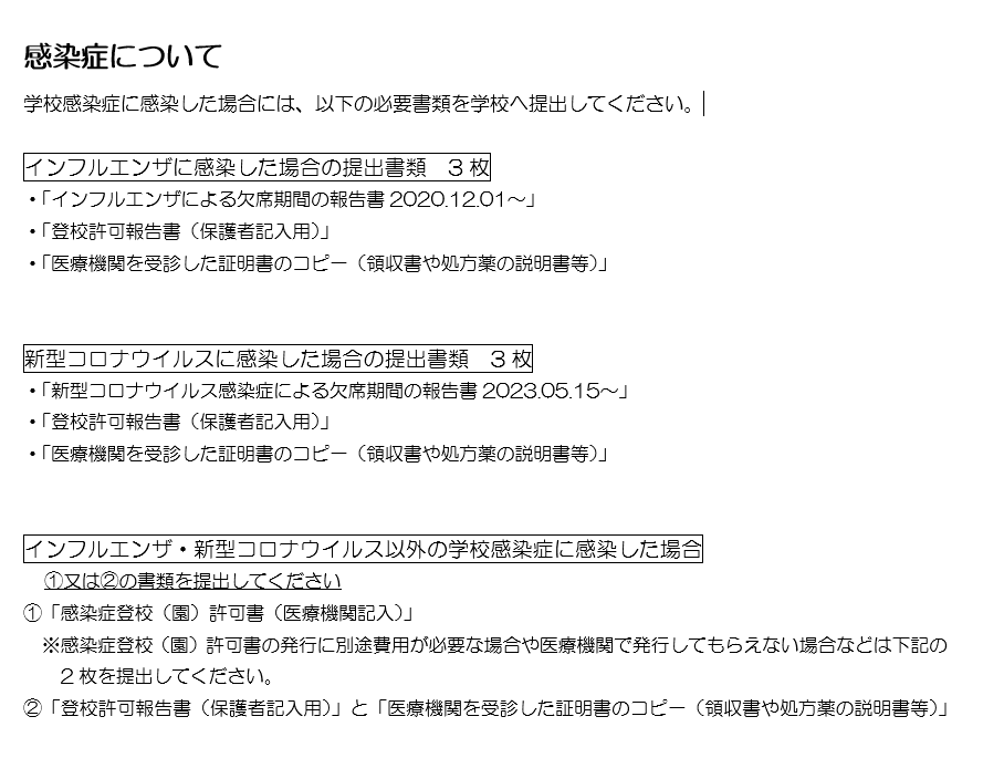 学校感染症に感染した場合には、以下の必要書類を学校へ提出してください。